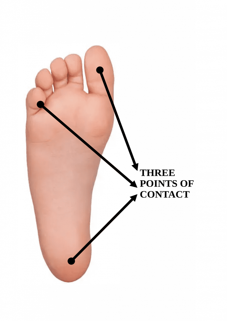 The Three Points of Contact: Imagine a tripod under each foot, with contact points at the base of the big toe, the base of the little toe and the centre of the heel.